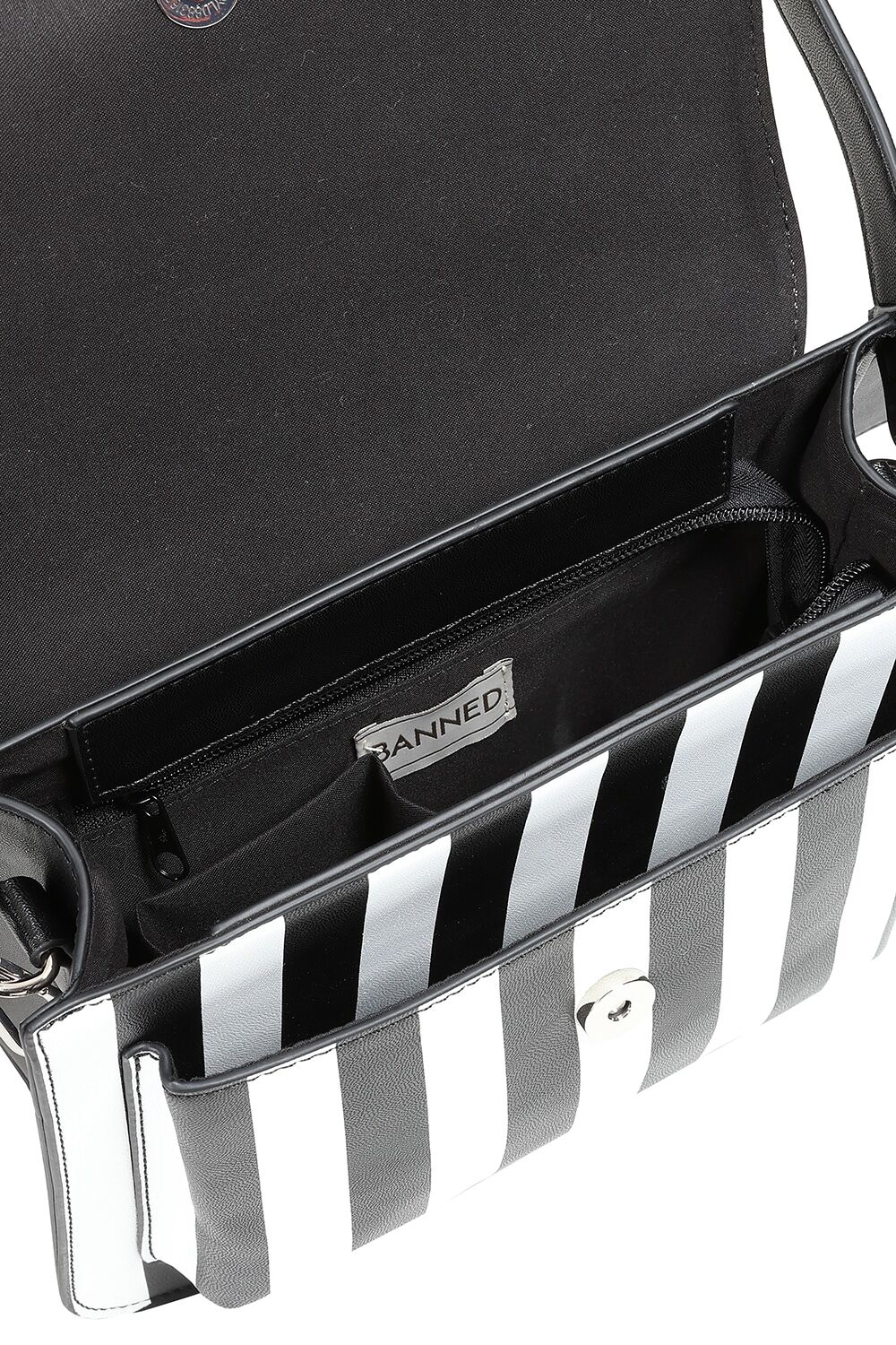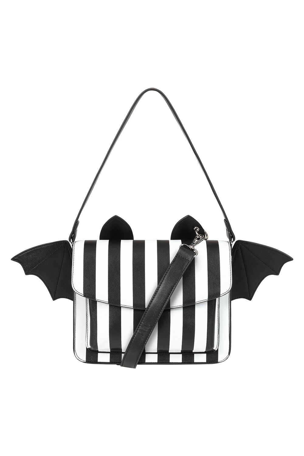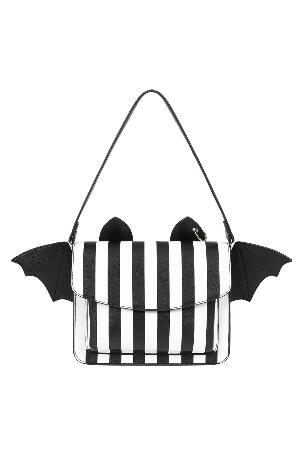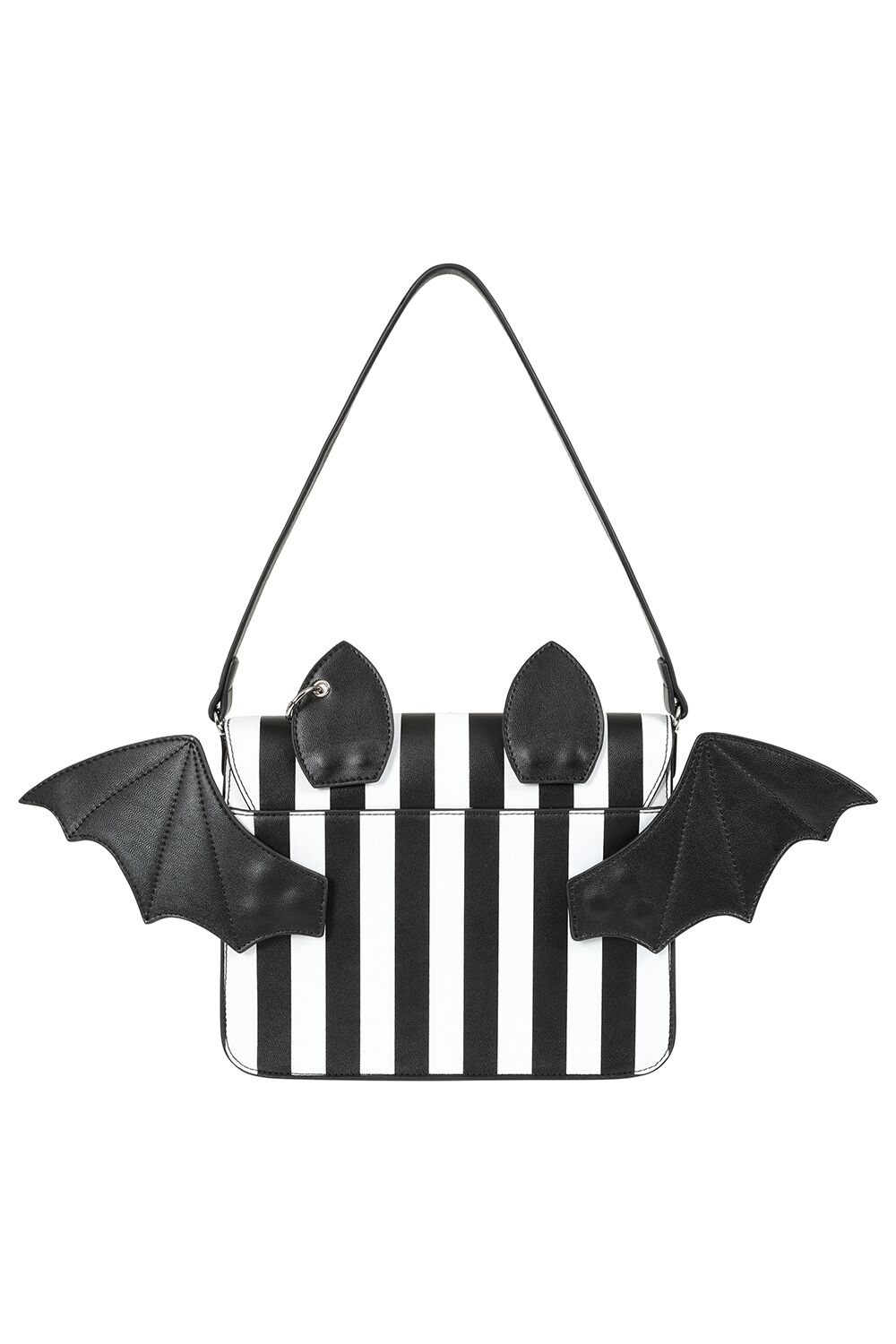 Soma, pieni mustavalkoraidallinen lepakkolaukku irrotettavilla siivillä ja korvilla. Kolme sisätaskua, joista yksi vetoketjulla. Säädettävä, irrotettava olkaremmi.