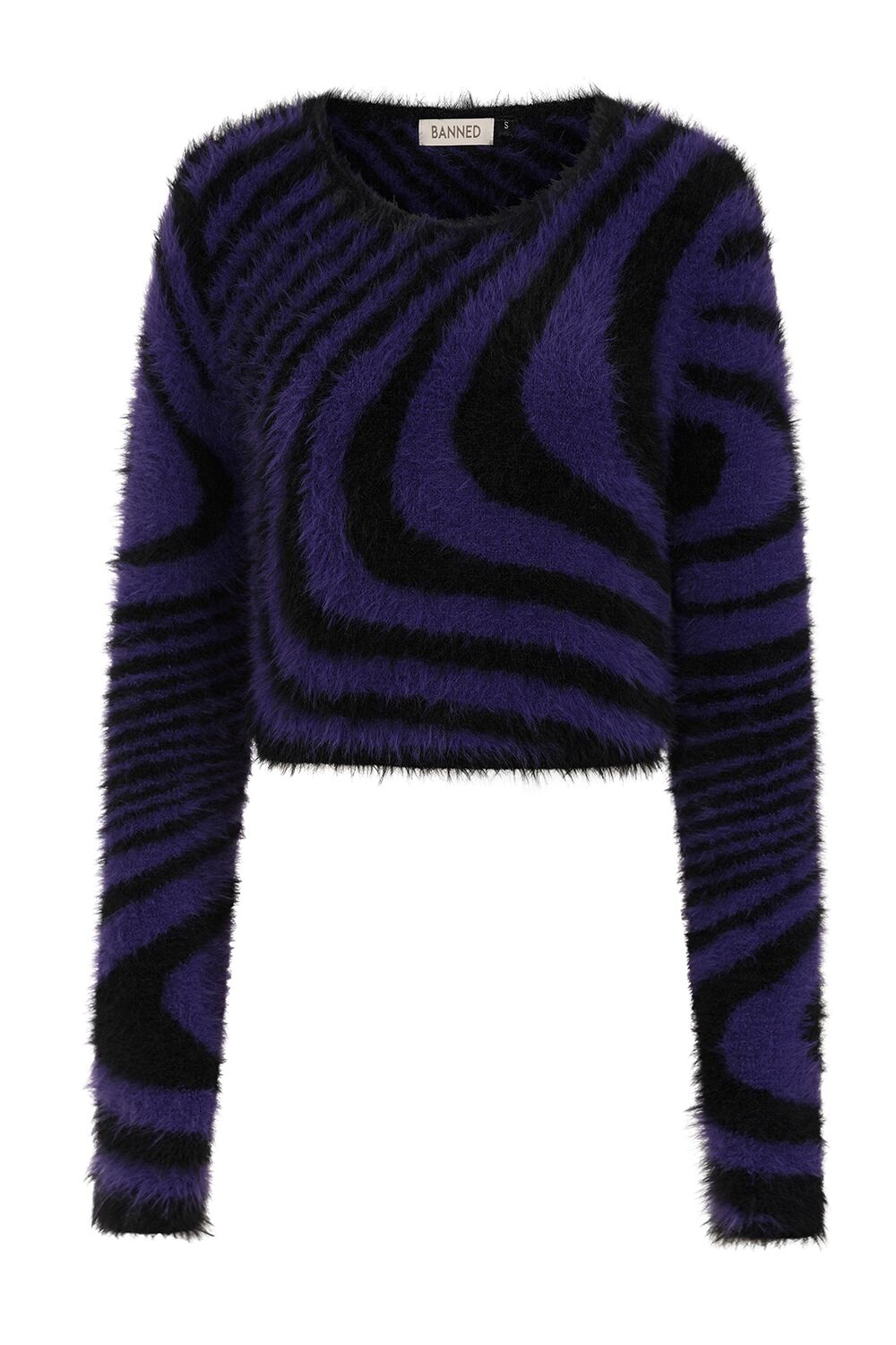 Pörröinen neule violeteilla ja mustilla raidoilla. Normaali mitoitus. Erittäin joustava materiaali.