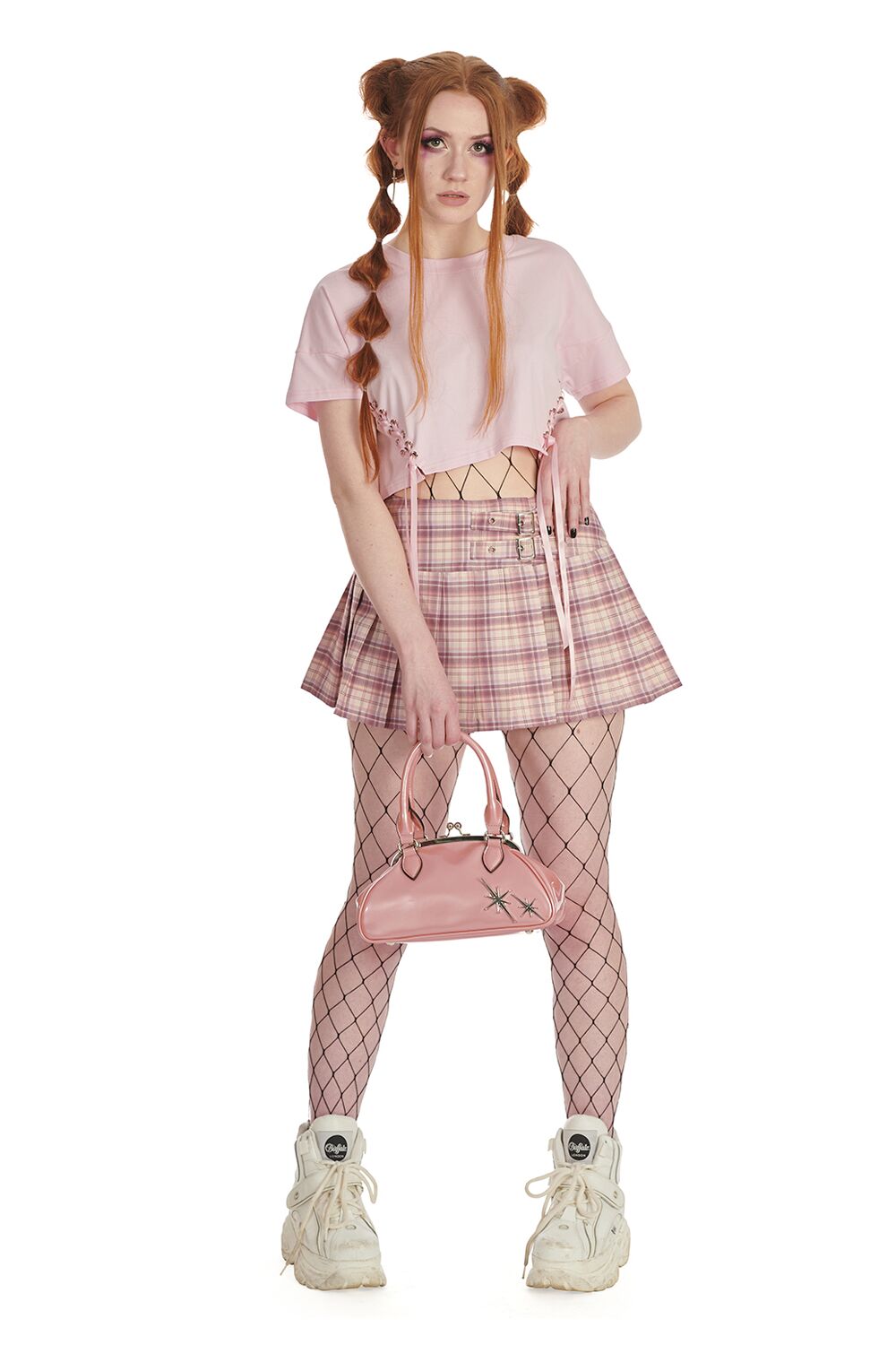 Klassinen, kietaistava vekkiminihame pastellisävyisestä skottiruutukankaasta matalalla vyötäröllä. Kiinnitys tarroilla ja kahdella soljella.